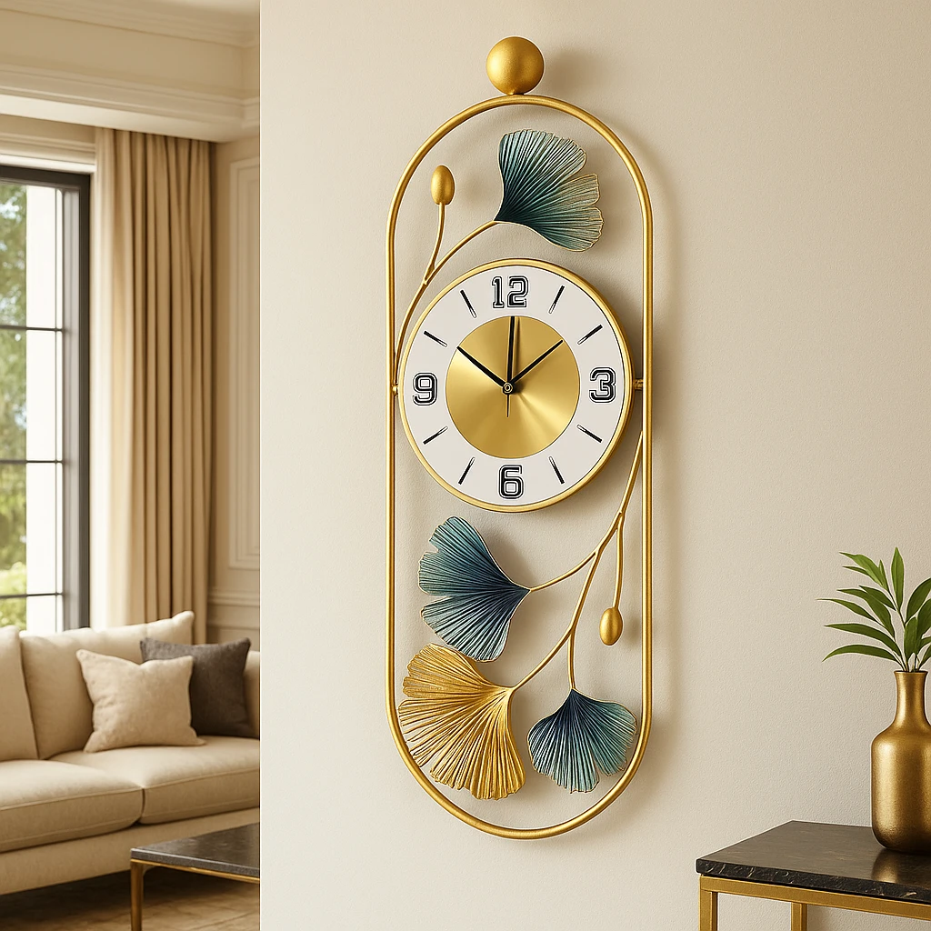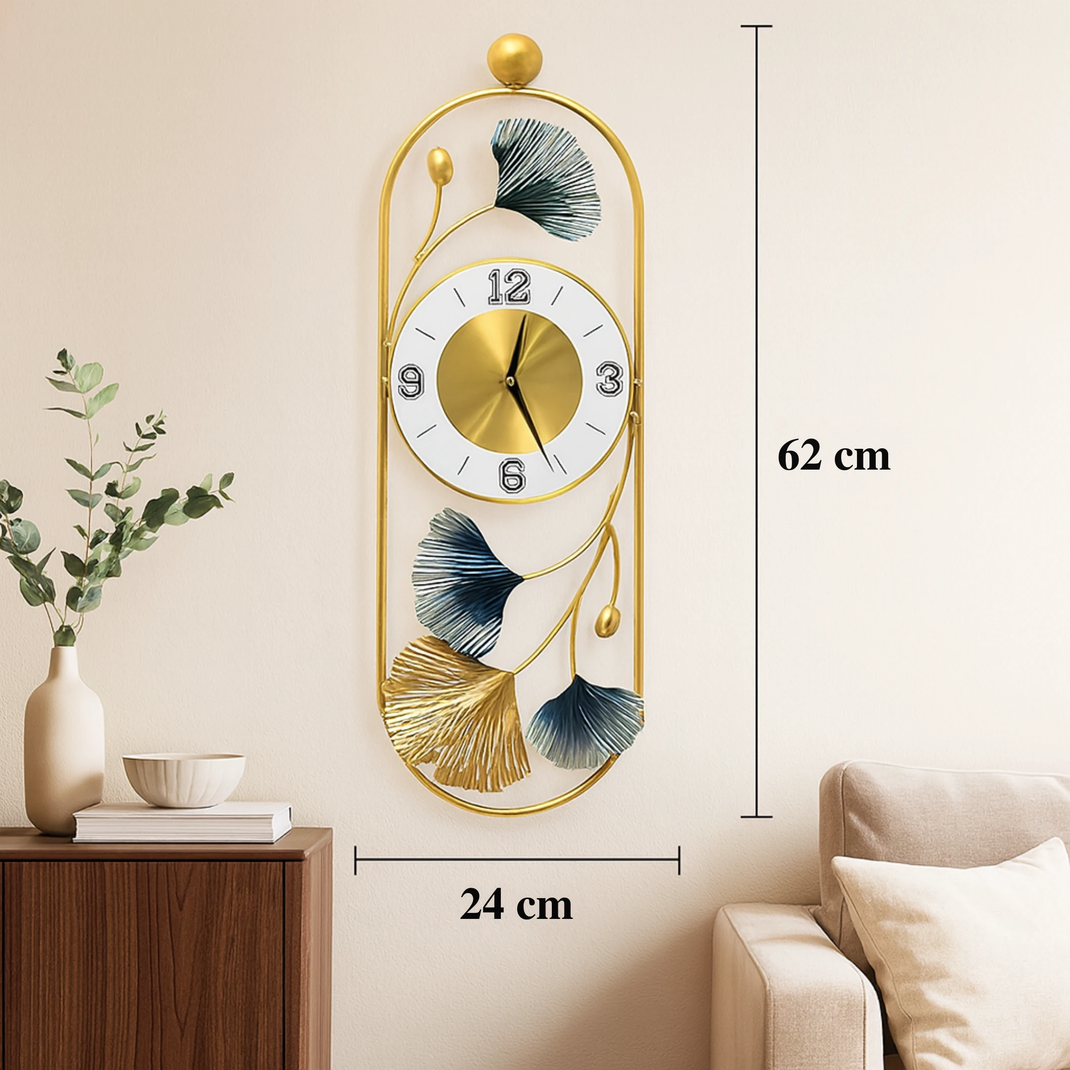 Enhance your space with this premium designer wall clock from Rioh Decor. Featuring a modern vertical metal frame with elegant leaf detailing, this clock adds a luxurious and artistic touch to any living room, bedroom or office.