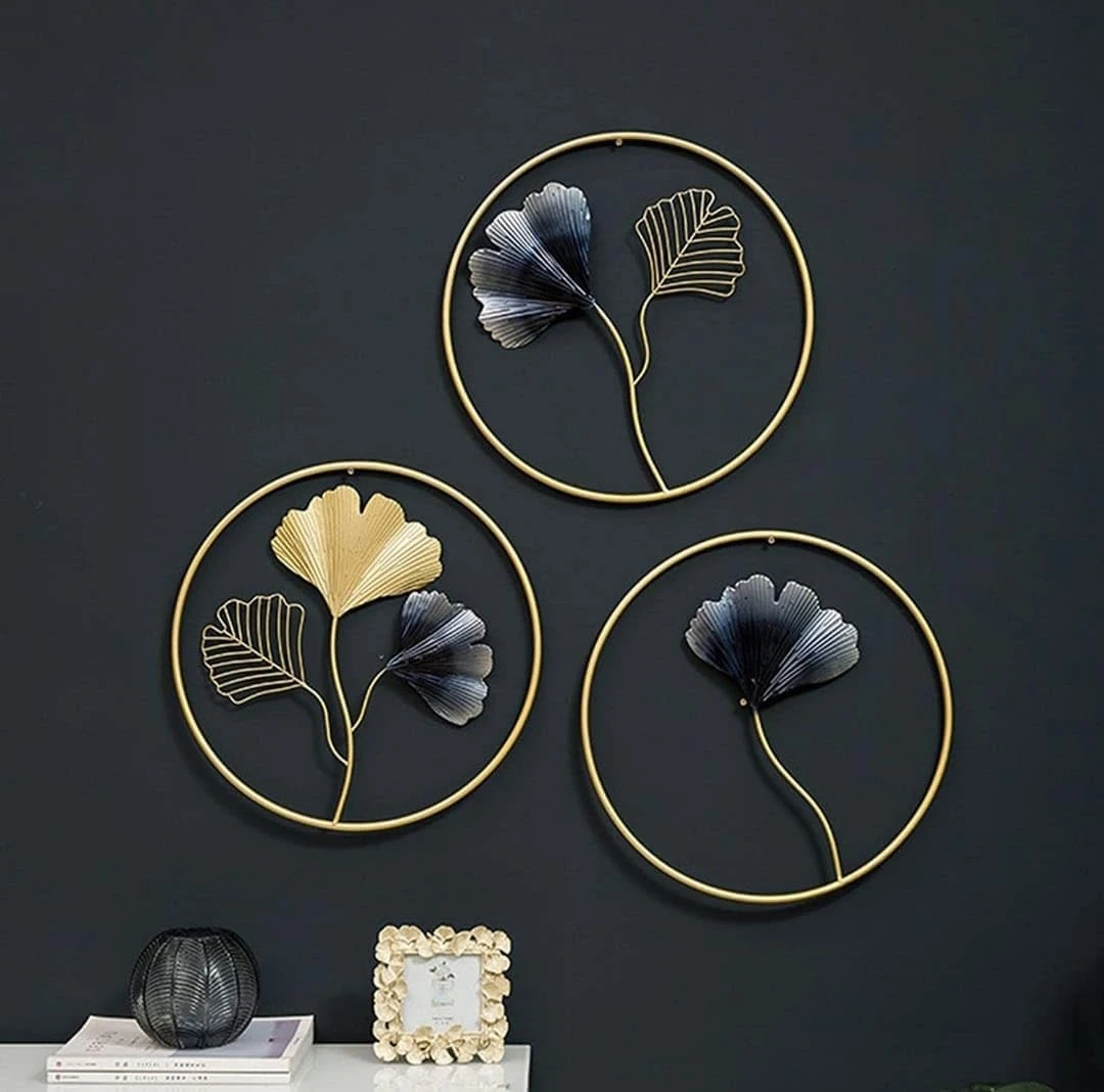 Add an artistic touch to your interiors with the RIOH Golden & Blue Ginkgo Leaf Wall Art. This elegant set of 3 round metal frames features finely crafted ginkgo leaves in luxurious gold and blue tones, symbolizing peace and longevity. Perfect for creating a modern, stylish look in your living room, dining space, bedroom, or office.