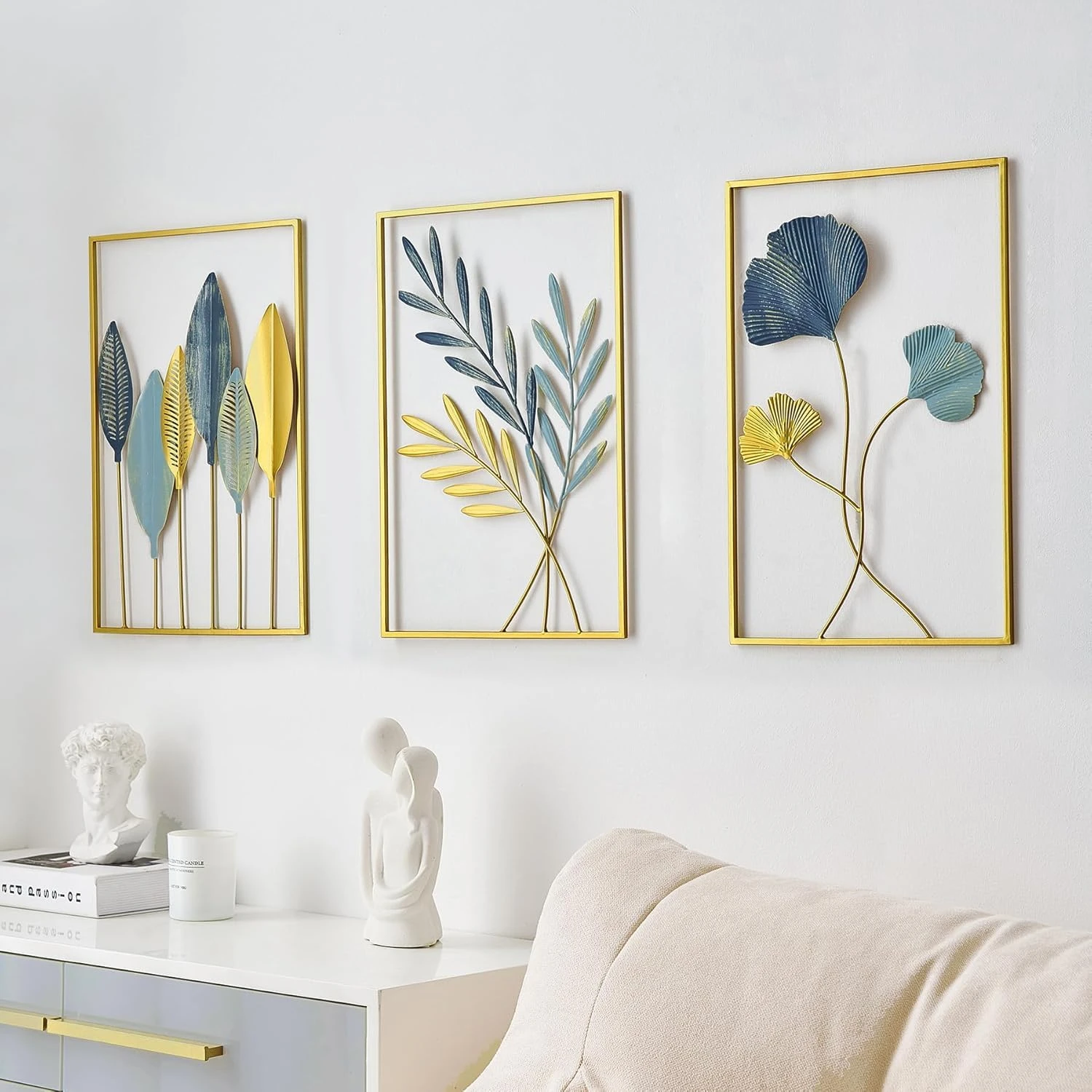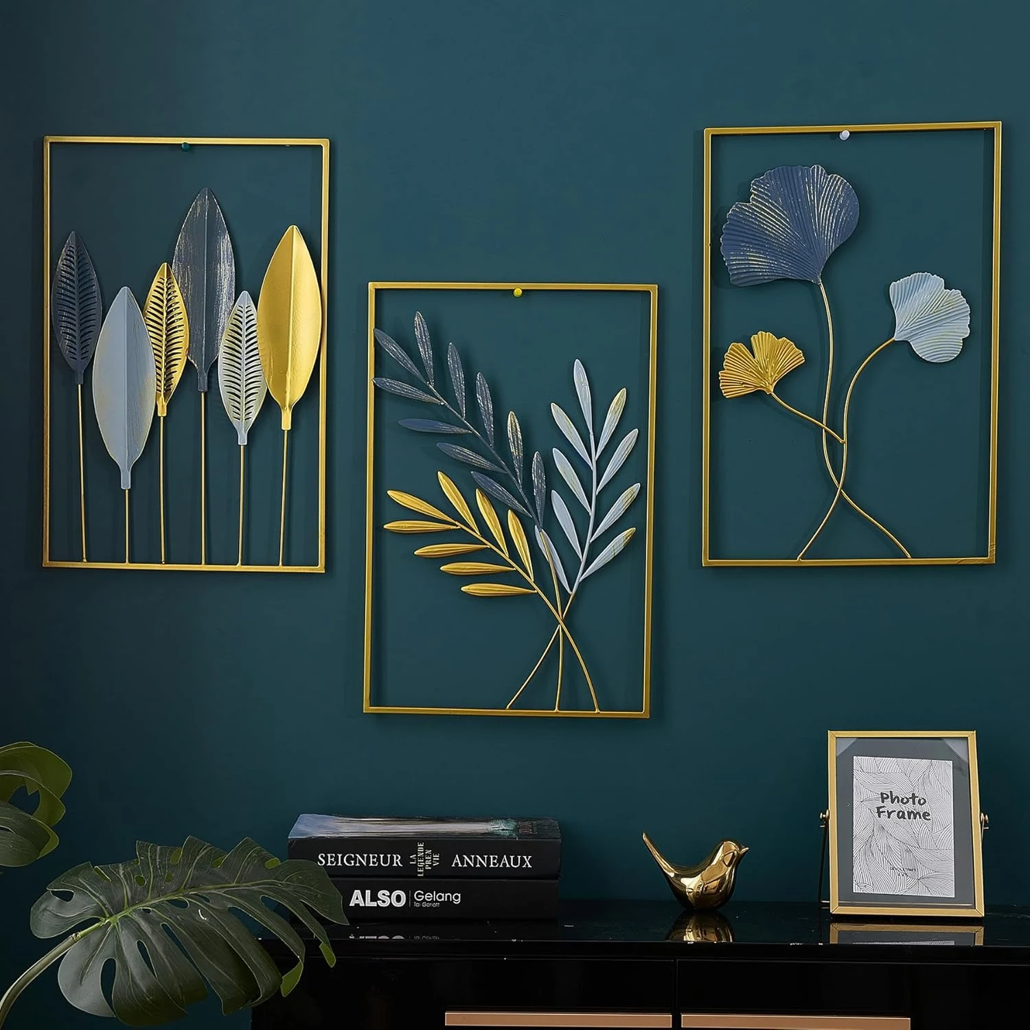 Enhance your home interiors with the RIOH Nature Inspired Leaf Metal Wall Art. This elegant set of 3 vertical rectangular frames features handcrafted leaves in soothing shades of gold, blue, and teal, giving your walls a sophisticated and contemporary look. Perfect for dining areas, living rooms, bedrooms, and offices.