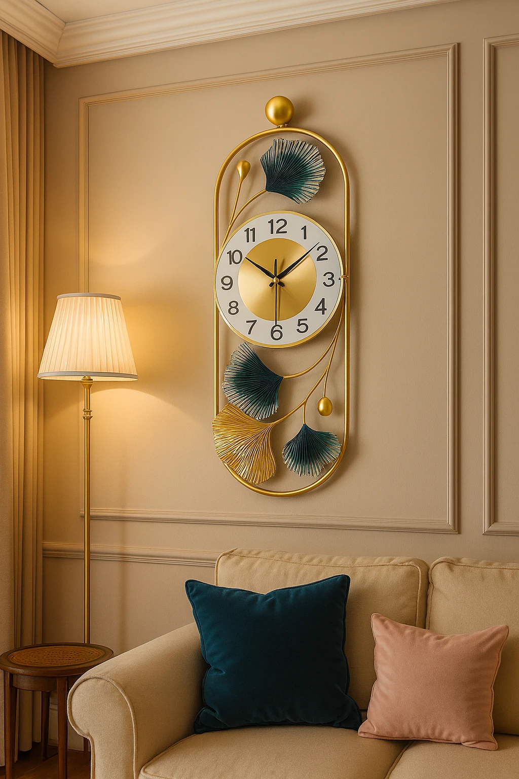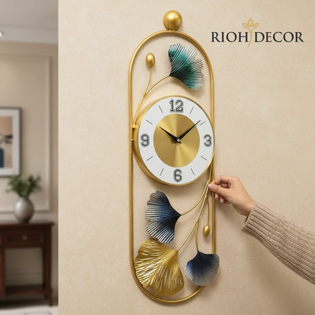 Enhance your space with this premium designer wall clock from Rioh Decor. Featuring a modern vertical metal frame with elegant leaf detailing, this clock adds a luxurious and artistic touch to any living room, bedroom or office.