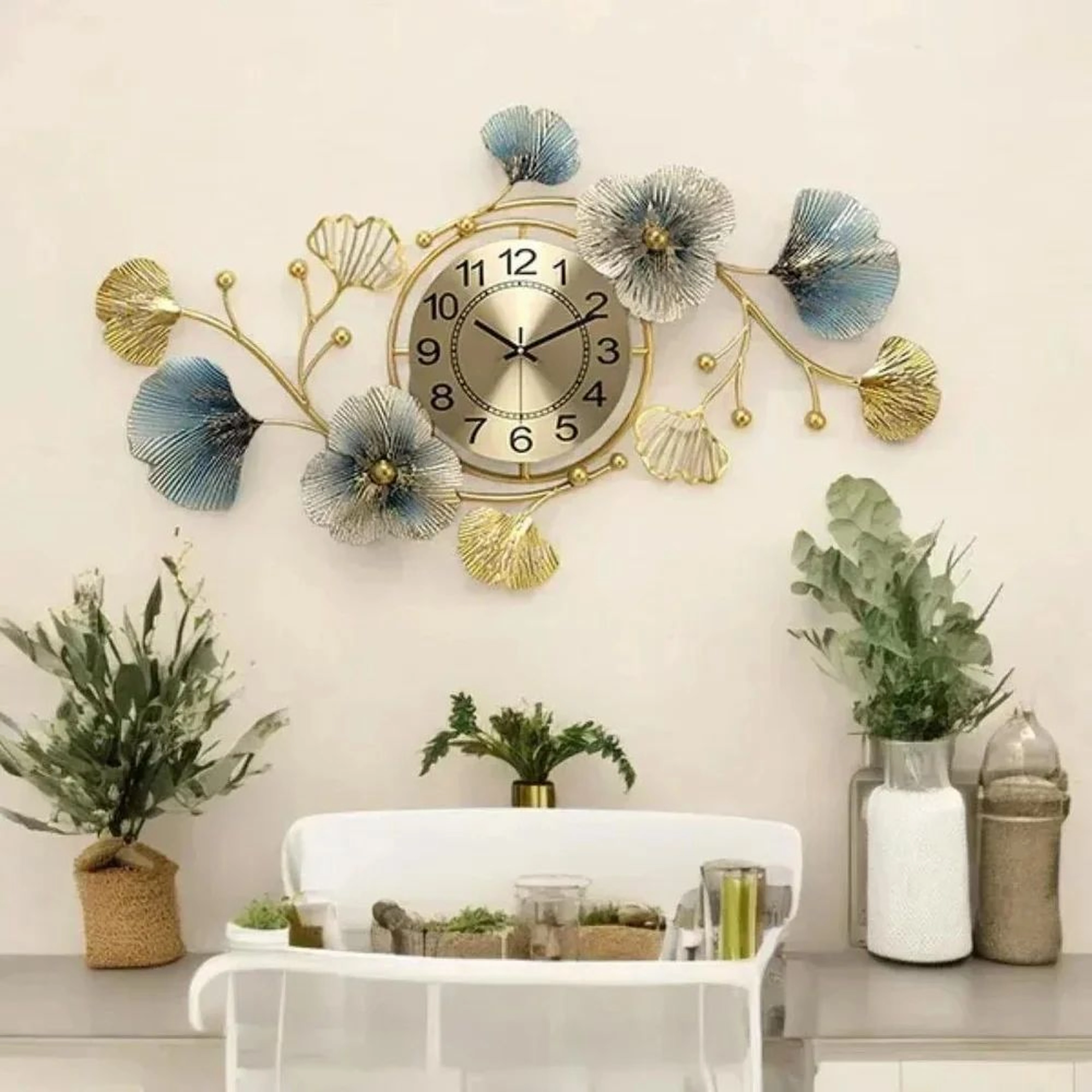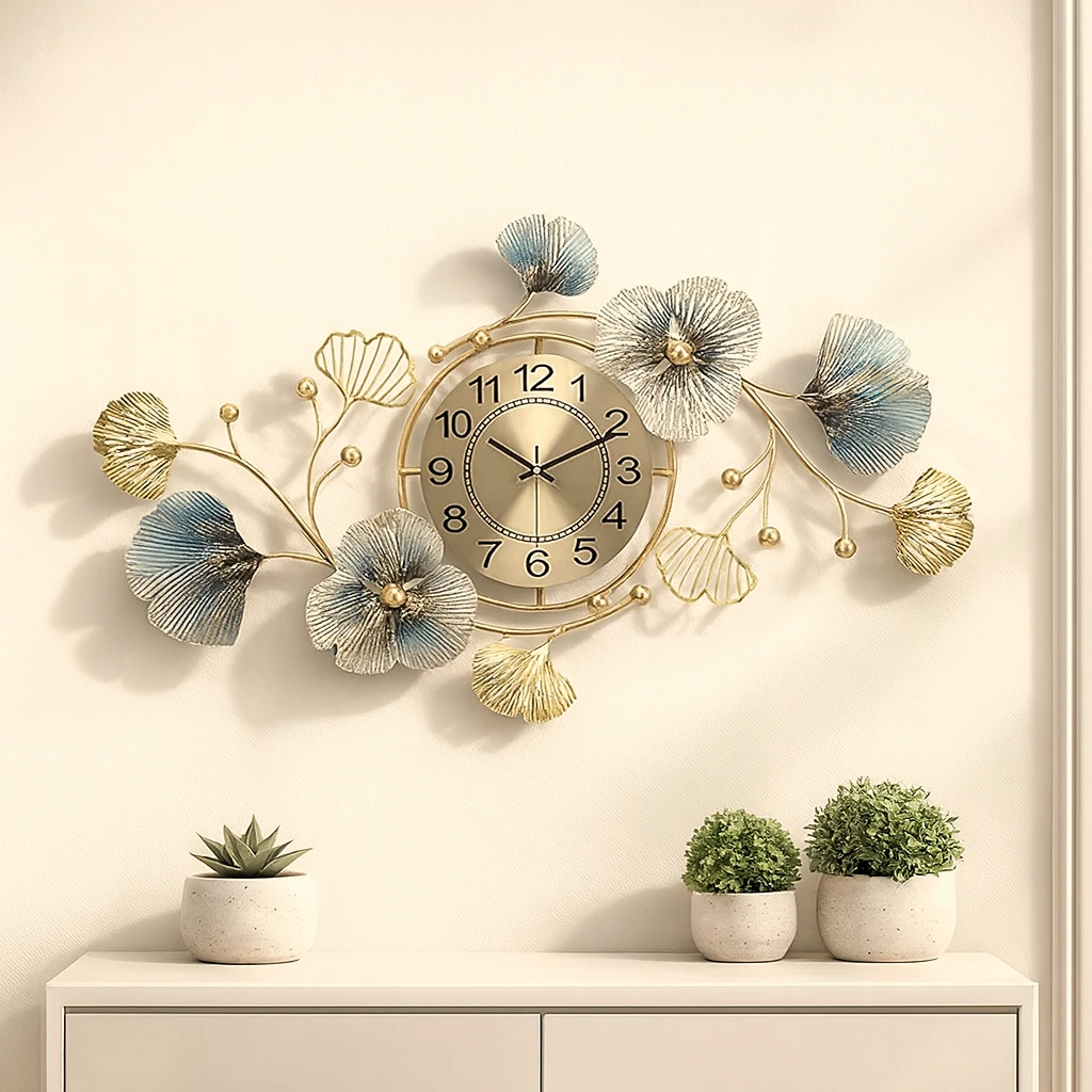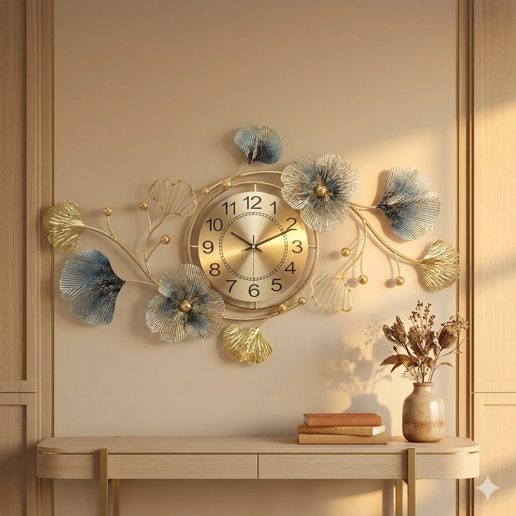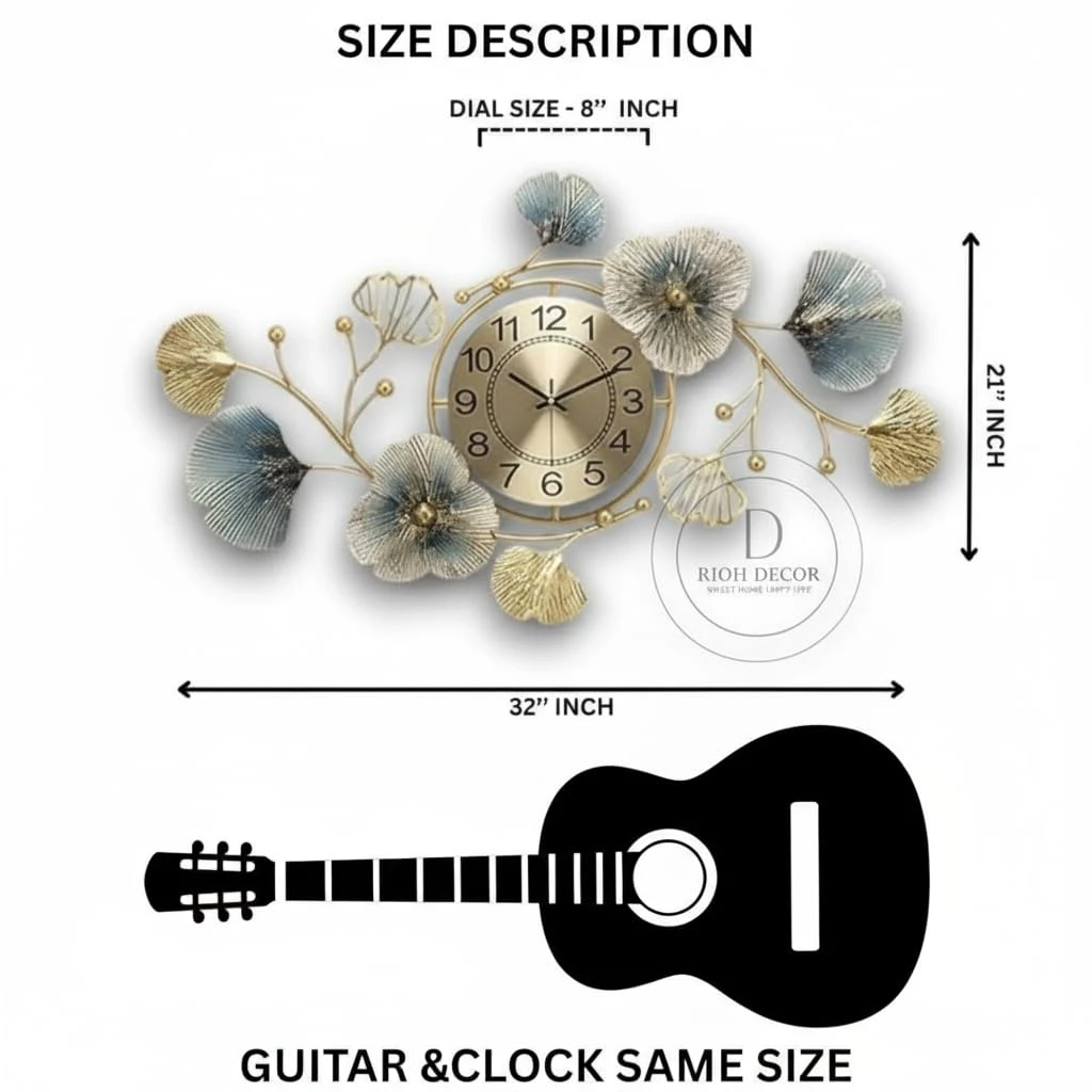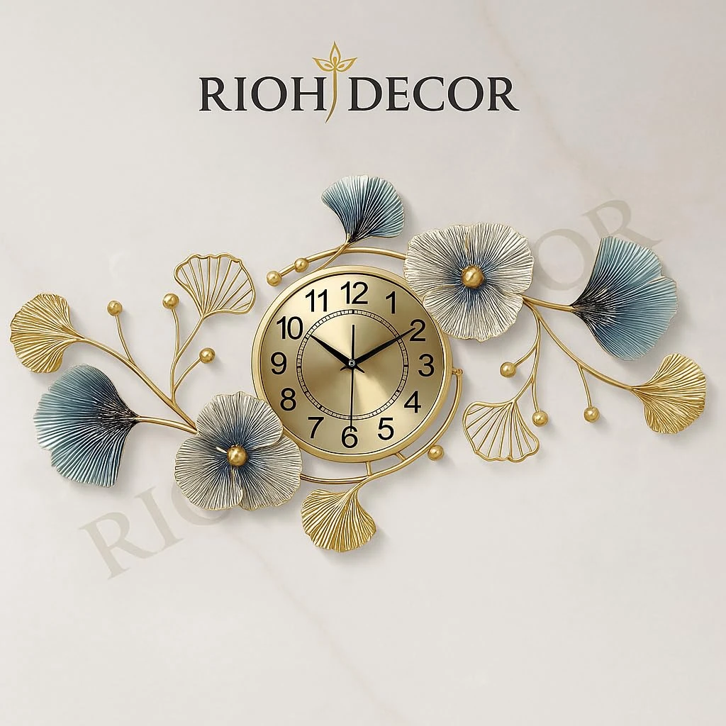 Enhance your home with this premium floral metal wall clock from Rioh Decor. Designed with elegant blue and gold leaf elements, it adds a luxurious and artistic touch to any living room, bedroom, dining area or office.