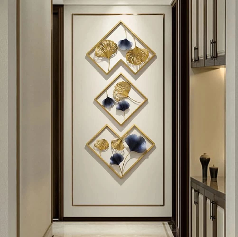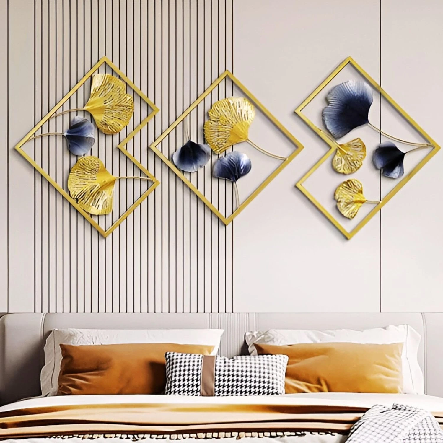 Bring a modern luxury touch to your home with the Rioh Decor Ginkgo Diamond Metal Wall Art Set of 3. Designed with premium metal construction, this wall decor features stylish gold diamond frames combined with elegant blue and gold ginkgo leaves.